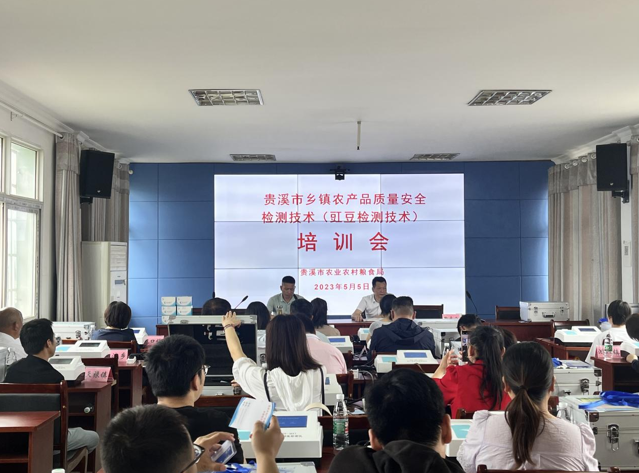 為不斷提升農(nóng)產(chǎn)品質(zhì)量安全監(jiān)管能力,鍛造農(nóng)產(chǎn)品質(zhì)量安全快速檢測(cè)過(guò)硬隊(duì)伍,保障農(nóng)產(chǎn)品質(zhì)量安全。江西省鷹潭市貴溪市農(nóng)業(yè)農(nóng)村糧食局于2023年5月5日舉辦了“貴溪市鄉(xiāng)鎮(zhèn)農(nóng)產(chǎn)品質(zhì)量安全檢測(cè)技術(shù)(豇豆檢測(cè)技術(shù))培訓(xùn)會(huì)”。貴溪市農(nóng)糧局分管領(lǐng)導(dǎo),貴溪市農(nóng)糧局市場(chǎng)信息與農(nóng)產(chǎn)品質(zhì)量安全監(jiān)管股領(lǐng)導(dǎo)及監(jiān)管股各干事、廣州瑞森生物科技股份有限公司相關(guān)領(lǐng)導(dǎo)和同事以及貴溪市18個(gè)涉農(nóng)鄉(xiāng)鎮(zhèn)及鷹潭市高新區(qū)白露街道辦事處共40余名檢測(cè)員參加本次培訓(xùn)會(huì)議。