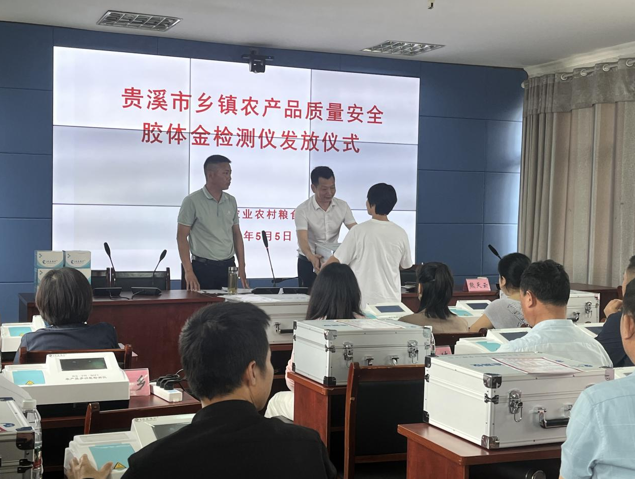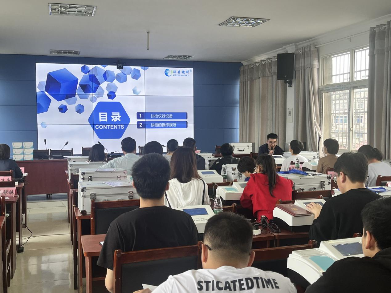 在培訓(xùn)會(huì)上,貴溪市農(nóng)糧局為全市18個(gè)鄉(xiāng)鎮(zhèn)統(tǒng)一配備膠體金、酶抑制多功能快速檢測(cè)儀,局分管領(lǐng)導(dǎo)熊天云就新設(shè)備使用、豇豆種植及檢測(cè)相關(guān)注意事項(xiàng)做了強(qiáng)調(diào),并要求大家堅(jiān)決貫徹落實(shí)新農(nóng)安法,嚴(yán)格按照部省共建有關(guān)要求開(kāi)展農(nóng)安工作,確保及時(shí)有效發(fā)現(xiàn)并處置農(nóng)產(chǎn)品質(zhì)量安全風(fēng)險(xiǎn),確保膠體金免疫檢測(cè)任務(wù)全部按時(shí)完成。 瑞森生物技術(shù)人員在本次培訓(xùn)會(huì)上,通過(guò)現(xiàn)場(chǎng)操作示教的方式,為現(xiàn)場(chǎng)與會(huì)人員生動(dòng)詳細(xì)的培訓(xùn)了膠體金快速檢測(cè)儀的操作使用方法、使用膠體金檢測(cè)卡對(duì)蔬菜農(nóng)藥殘留進(jìn)行快速檢測(cè)示范操作以及畜禽產(chǎn)品獸藥殘留檢測(cè)等相關(guān)內(nèi)容。并現(xiàn)場(chǎng)考核了各鄉(xiāng)鎮(zhèn)檢測(cè)人員對(duì)韭菜、空心菜、西葫蘆、豬肉、牛尿等常見(jiàn)農(nóng)產(chǎn)品的膠體金卡檢測(cè)操作能力。